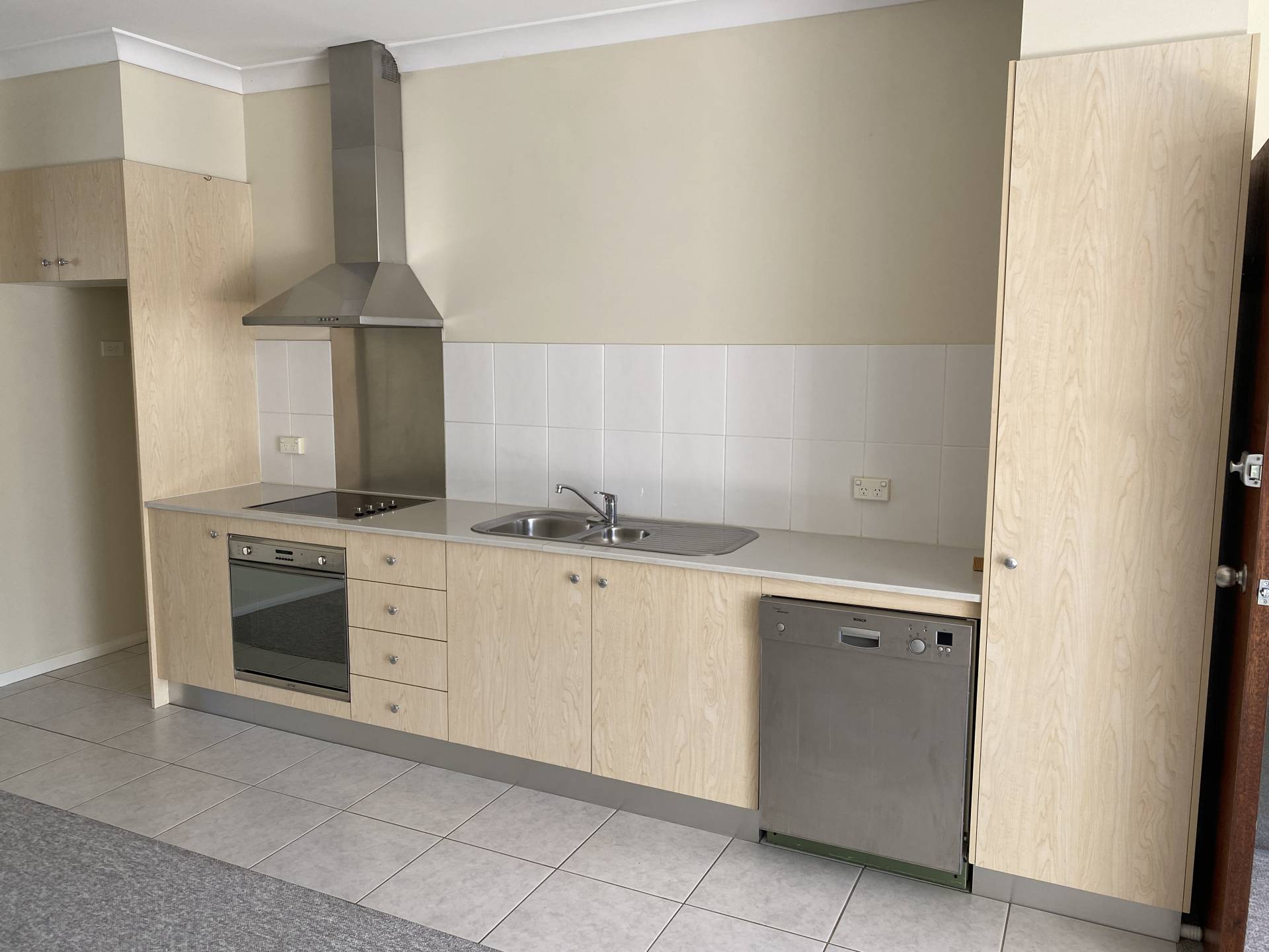 * Galley kitchen with stainless steel appliances, electric cooking & dishwasher